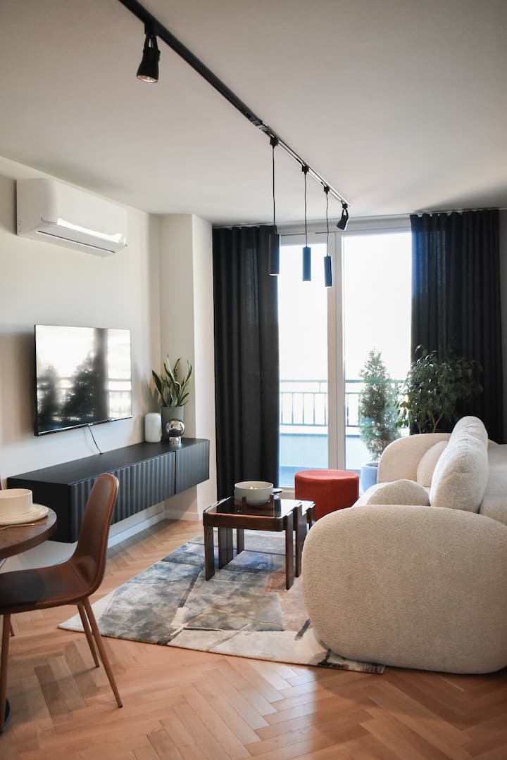 Entrando, sarai accolto da uno spazio abitativo aperto e arioso pieno di luce naturale. I caldi pavimenti a spina di pesce scorrono in tutto l'appartamento, portandoti nel cuore della casa. Rilassati sul morbido e invitante divano bouclé dopo una giornata trascorsa a esplorare Ohrid o riproduci in streaming le tue serie preferite sulla Smart TV. Questa zona centrale è completamente climatizzata, garantendo il tuo comfort anche nei pomeriggi estivi più caldi. Adiacente all'area salotto c'è un elegante tavolo da pranzo per quattro, perfetto per condividere un pasto o pianificare le avventure del giorno successivo.