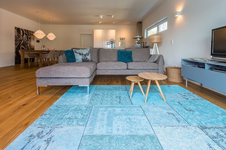 Le caratteristiche di alta qualità sono state unite armoniosamente con materiali naturali. Classical plank oak nature in all living areas including heated floors, stylish kitchens with white high-gloss fronts and a gray stone worktop, the bathroom in concrete optics and exclusive furniture. Goditi il tuo soggiorno in questo meraviglioso ambiente!