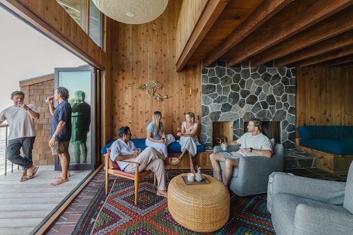 • Soggiorno: originale divano a forma di U in stile anni '70 con cuscini profondi, camino rivestito in pietra locale tagliata a mano con panca, un armadietto TV nascosto che potresti non notare se non guardi attentamente e enormi porte La Cantina che si aprono sulla tua terrazza privata sull'oceano. Sedersi in salotto e lasciar entrare la brezza mentre si gode di una vista completamente libera sull'oceano è davvero speciale.