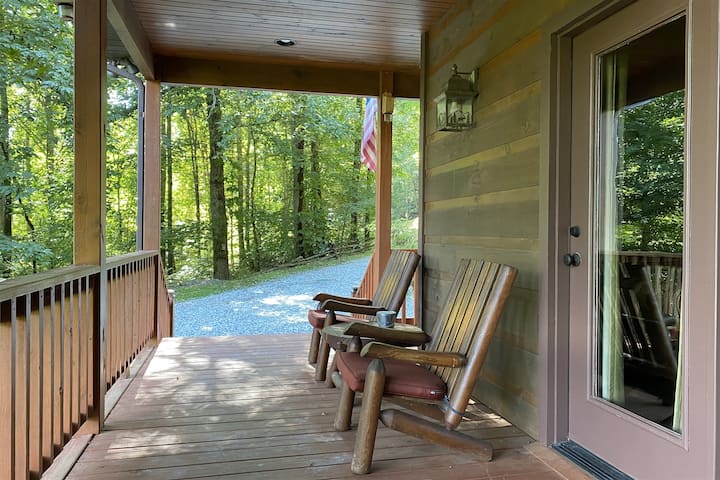 2 camere da letto e 2 bagni. La prima camera da letto dispone di un letto king-size, accesso al portico e bagno privato con ripiani in granito, doppio lavabo e doccia in piastrelle di pietra. La seconda camera da letto ha un letto matrimoniale e una porta di accesso al secondo bagno completo. La sala video fuori dalla sala da pranzo/zona cucina dispone di TV e divano letto per ospiti aggiuntivi. Questa è una baita su un solo livello.
