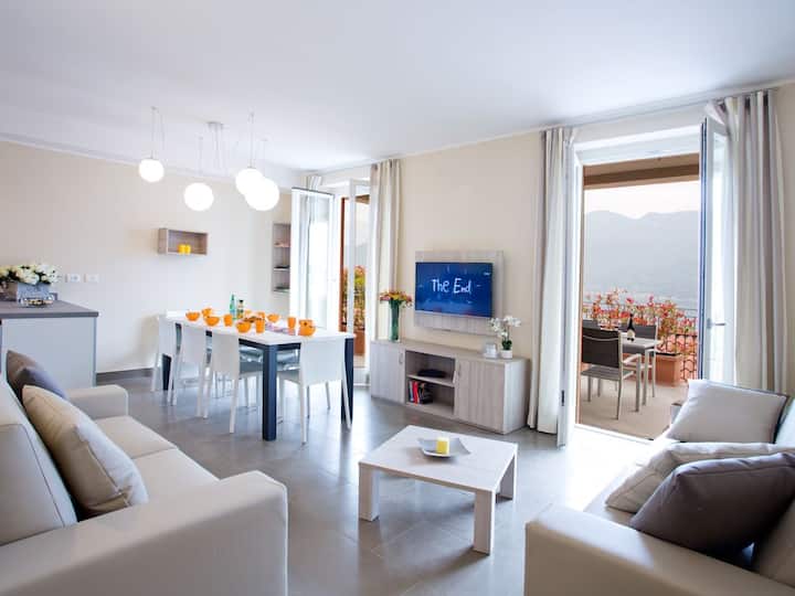 Nuovissima cucina moderna con tutti i comfort della casa. Soggiorno confortevole, perfetto per rilassarsi e godersi la vita sul Lago di Como.