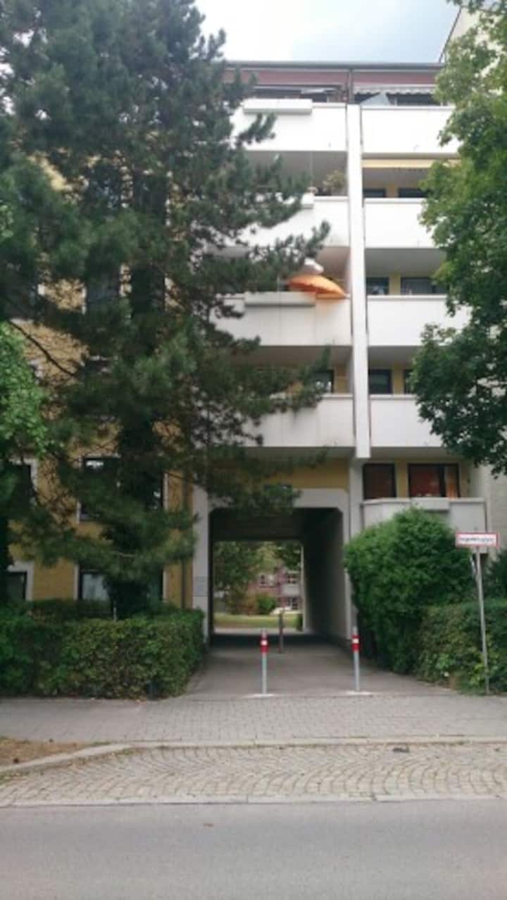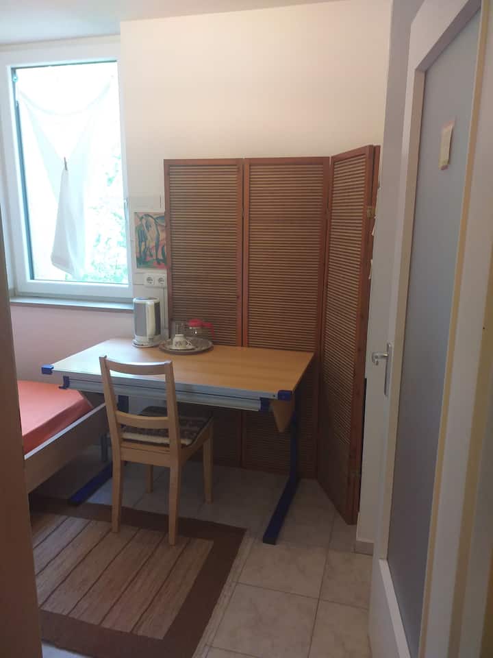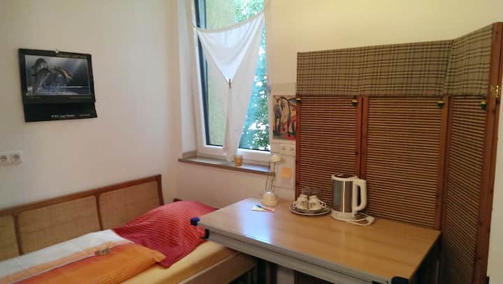 Si tratta di una piccola stanza confortevole con un letto (200x100 cm), una scrivania (120x70 cm) e nessuno spazio per un armadietto. Il frigorifero per gli ospiti si trova all'esterno della tua camera. Un bagno è condiviso. La nostra posizione è molto comoda per il centro città, Hbf, Messe, Uni e Oktoberfest, ecc.