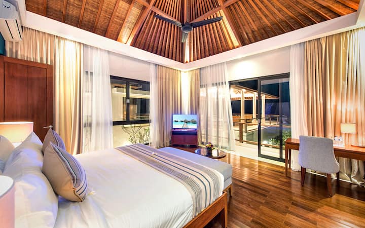 La camera da letto principale si trova all'ultimo piano e si affaccia sull'oceano con una facciata completamente in vetro e una combinazione di colori blu, argento e crema. Un albero di frangipane cresce dal livello inferiore per fiorire all'altezza degli occhi fino al letto king-size. Il bagno padronale è dotato di vasca e pavimenti in marmo con doccia frontale in vetro e WC uno accanto all'altro. Una sostanziale cabina armadio doppia è a destra con pannelli scuri e ampi specchi. Lampade sottili, una scrivania e una TV via cavo LG, offrono un comfort extra per il padrone di questa villa, e spesse tende color crema bloccheranno la luce del mattino se lui o lei vuole recuperare un po 'di sonno di bellezza.