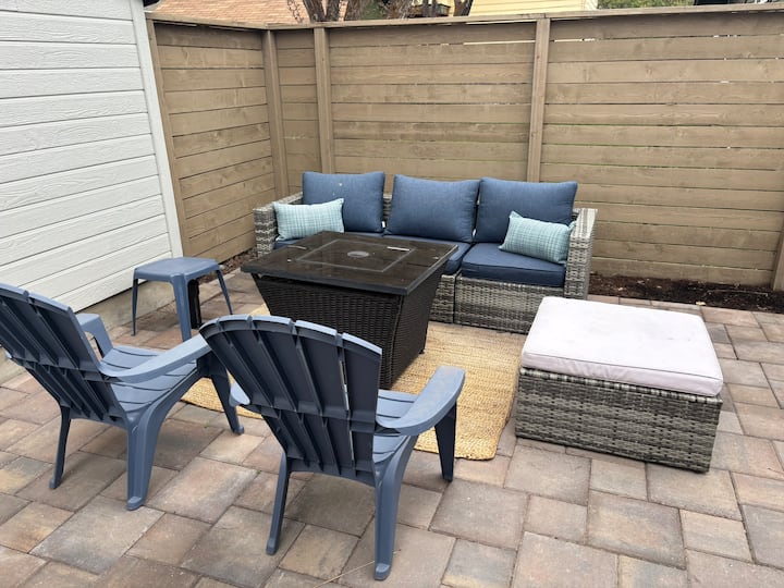 Vita all'aperto: un accogliente portico anteriore (ideale per il caffè del mattino) e un patio posteriore privato ti aspettano. Il cortile sul retro dispone di un braciere e di una griglia per barbecue con zona pranzo, perfetta per arrostire s'mores sotto le stelle o godersi un barbecue estivo. (Se stai cercando un alloggio Airbnb con braciere e barbecue, questo è quello giusto!)