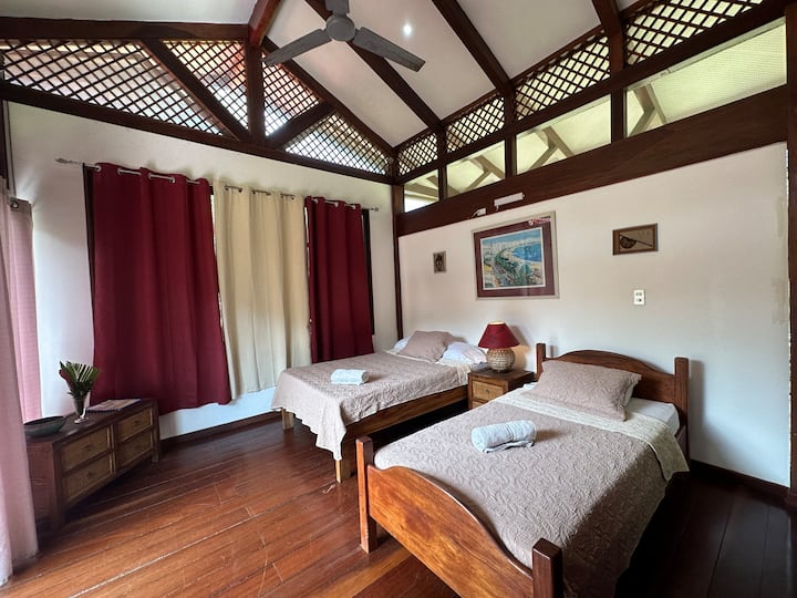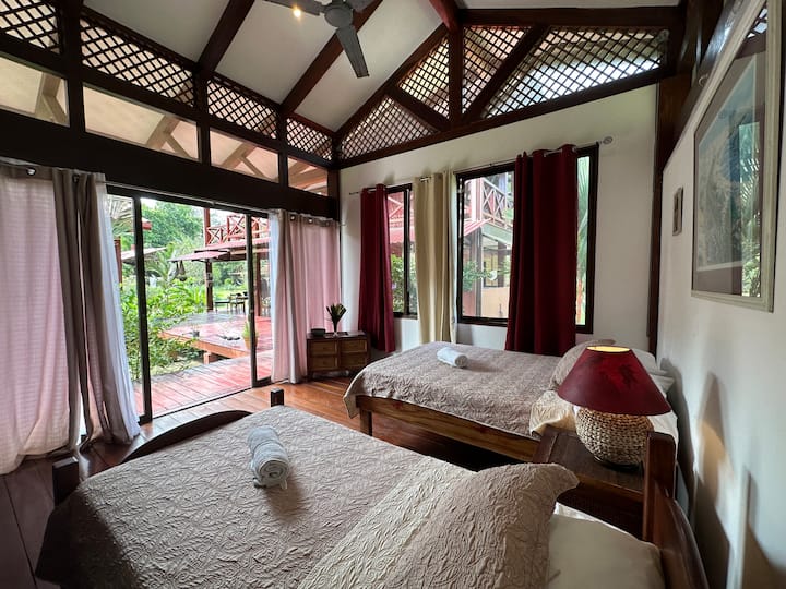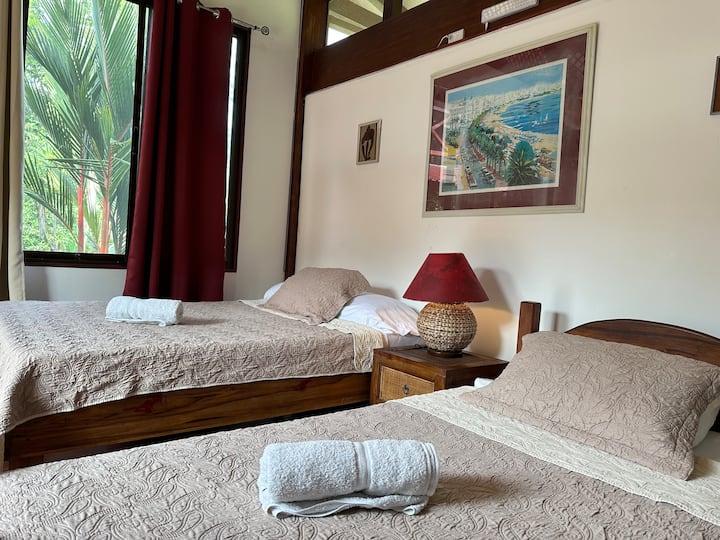 È un'oasi di pace, costruita in modo ecologico, nei boschi caraibici, circondata da una natura lussureggiante e situata di fronte al mare a soli 100 metri da Playa Grande de Cahuita, dove le tartarughe marine vengono a bandire le tartarughe marine tra marzo e ottobre.