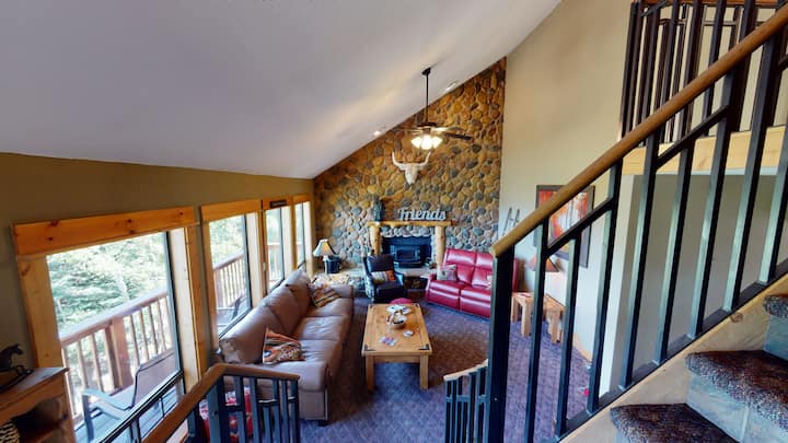 Benvenuto al WillyJohn 's Cabin Real. Questa casa con cinque camere da letto e tre bagni può ospitare quindici persone ed è immersa tra gli alberi, lontano dalla strada principale che porta sulla montagna. Il livello più basso di questa casa su più livelli è una grande stanza di fango con una panca sotto un ripiano in legno con armadietti per gli stivali, un posto dove appendere l'attrezzatura da ciclismo che vuoi lasciare ad asciugare, armadietti e un gioco arcade Pop-A-Shot per l'intrattenimento al coperto. Il primo livello ha due camere da letto, una con un letto matrimoniale, un armadio rifornito di carte, domino e tanti giochi per tutte le età, una vista mozzafiato su cui svegliarsi e una porta scorrevole che si apre sul ponte inferiore. La seconda camera da letto (la camera a castello) ha una serie di letti a castello a due piazze, un set di letti a castello full over-twin e una smart TV. Il bagno su questo livello dispone di una zona vanity e di una vasca con doccia integrata. Il livello principale ha una cucina completa ben attrezzata, una macchina per il caffè a goccia monodose/da 12 tazze, un bancone doppio che può ospitare 7 persone e una TV abilitata ROKU per chi è in cucina per godersi l'intrattenimento mentre si mangia o si socializza. La zona pranzo ha un grande tavolo con sei sedie vicino alle finestre dove potresti vedere un cervo o un alce che mangia a pochi passi di distanza e ti osserva. La zona giorno ha un grande divano una doppia seduta reclinabile e una TV con tecnologia ROKU, il tutto situato intorno alla stufa/caminetto a legna in modo da poter stare a casa e rilassarsi accanto a un caminetto caldo godendo del panorama mozzafiato. È possibile accedere all'ampio ponte superiore sia dalla zona pranzo che da quella giorno. Questo livello dispone anche di una camera da letto con letto king-size e smart TV, oltre a un bagno completo con ampia cabina doccia e zona vanity. Il livello più alto ospita la camera da letto principale, una camera per gli ospiti e una zona loft. La camera da letto principale ha un letto king-size, una smart TV e un bagno in camera con un'ampia zona vanity e una cabina doccia piastrellata. La camera degli ospiti ha due letti singoli e un letto estraibile, oltre a una smart TV. Il loft si affaccia sulla zona giorno, che è stata trasformata in una grotta per bambini. Ha una poltrona e una sedia/letto convertibile che può ospitare un adulto o due bambini piccoli, una smart tv, e console Nintendo e PS 4 con giochi. C'è una lavasciuga al piano principale e una connettività Wi-Fi per la tua comodità. Con una vista mozzafiato, questa casa si estende su 1,5 acri; l'abbondanza di opportunità per osservare gli uccelli e la fauna selvatica e le escursioni in estate la rendono un luogo ideale in qualsiasi periodo dell'anno.