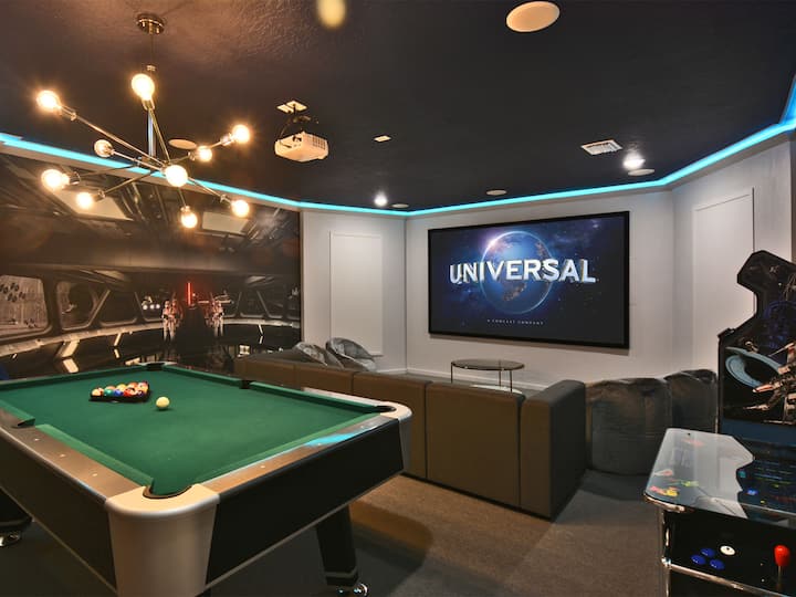 Schermo gigante da 125 pollici con incredibile audio surround e numerose opzioni per riprodurre film in streaming dalle tue fonti preferite (Netflix, Prime Video, Hulu, Disney+, ecc.) o guardare la TV via cavo, inclusi numerosi canali sportivi, o riprodurre qualsiasi Blu-ray o DVD che porti con te, o collegare i tuoi dispositivi a una presa a muro HDMI – Incredibile audio surround a 6 altoparlanti – Tavolo da biliardo da 2,3 metri – Incredibile macchina arcade di Star Wars – Console arcade classica a due posti con oltre 100 giochi.