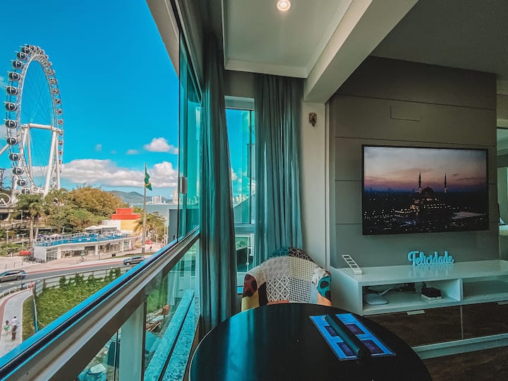 L'edificio si affaccia sul mare; l'appartamento si trova al quinto piano (5), a Barra Norte de Balneário Camboriú (quartiere Pioneiros) e offre una splendida vista dal balcone integrato (soggiorno) e dalla camera da letto su Morro da Rainha e sulla ruota panoramica BC Big Whell.