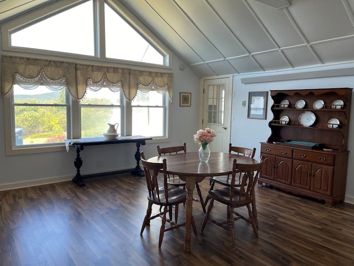 Non solo le viste sono incredibili, ma l'appartamento è anche spazioso e confortevole. La piccola cucina in stile cambusa è semplice ma funzionale e dispone di una dispensa per tutte le esigenze di stoccaggio. C'è una grande sala da pranzo con soffitto a cattedrale, un accogliente soggiorno con TV Roku e lettore DVD, un portico per tre stagioni e una grande terrazza. La camera da letto ha un letto king size con un materasso Sealy Perfect Sleeper 11" Tranquil Wave, tende oscuranti per la stanza, una cabina armadio con portabagagli, un sacco di cassetti e appendiabiti e un bagno completo con lavanderia. Ogni stanza ha il proprio termostato (nota: solo riscaldamento, non c'è l'aria condizionata) e le tende su ogni finestra ad eccezione delle finestre della cucina.