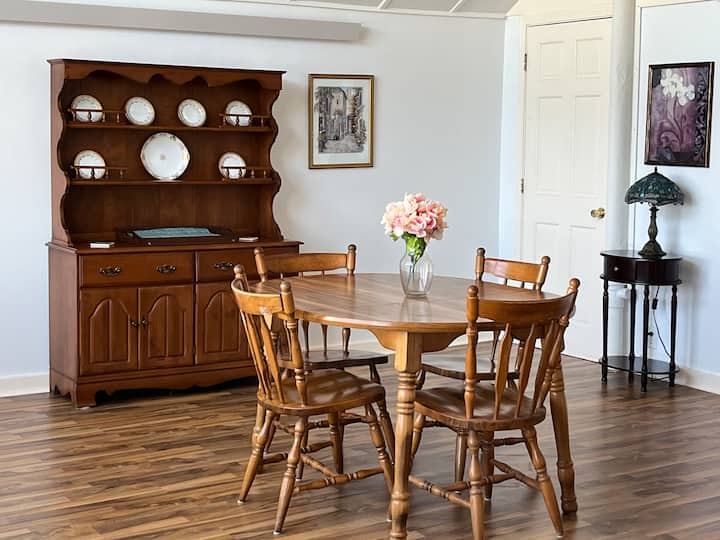 Questo appartamento di suocera è annesso alla casa principale, ma dispone di un proprio vialetto privato, ingresso, garage e terrazzo. L'ingresso è tramite il garage e una scala fino al piano superiore. Le finestre della casa principale si affacciano sulla terrazza e sul retro dell'appartamento, e il patio del proprietario confina con il cortile (il che significa che potresti occasionalmente sentire conversazioni mentre sei all'aperto o se le finestre sono aperte), ma avrai comunque tutta la privacy che desideri all'interno. Non c'è una porta di collegamento tra l'appartamento e la casa, e le uniche pareti condivise si trovano lungo il portico a tre stagioni, quindi c'è pochissimo passaggio sonoro tra le unità abitative.