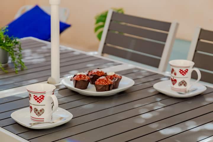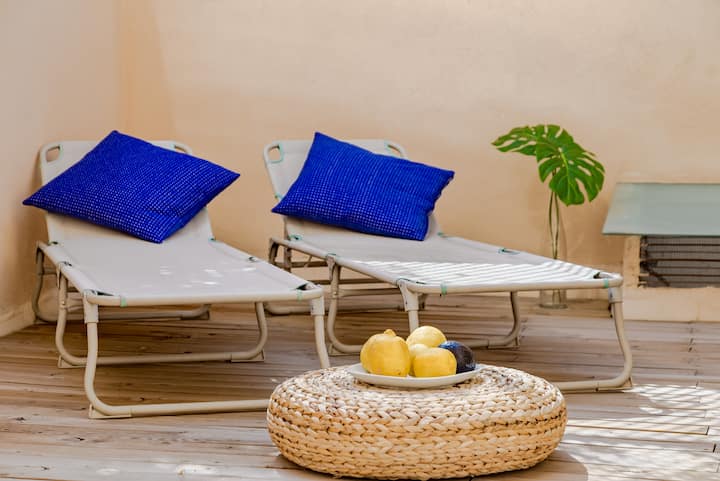 Ma ecco la cosa migliore di tutte: la terrazza - 100% privata per te e con accesso diretto dall'appartamento. Immagina di alzarti la mattina, di preparare una tazza di caffè e di camminare per salutare la città. C'è anche un tavolo e lettini in cui puoi rilassarti.