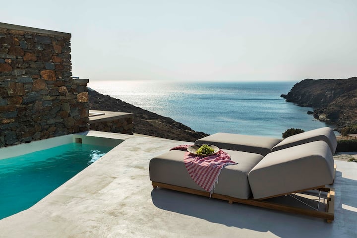 Villa Helios è arroccata sopra le sabbie dorate di Ballos Beach. Modellata con materiali di terra e ispirata alla vita estiva, questa lussuosa villa vista mare con piscina privata ha tutte le caratteristiche di un rifugio unico. Dotata di due camere da letto e due bagni, la villa può accogliere comodamente fino a 5 ospiti per godersi una vacanza utopica a Tinos. La villa si trova a soli due minuti a piedi dalla spiaggia.