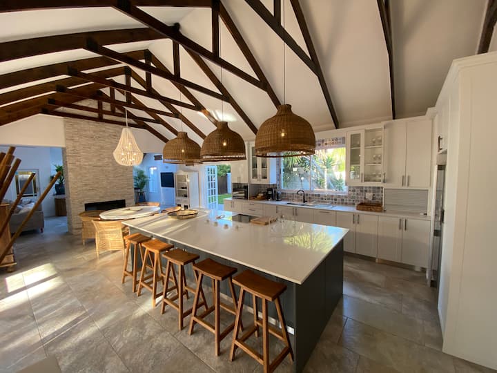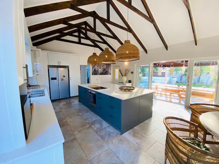 Questa casa ha una cucina da sogno nuova di zecca, completamente attrezzata, perfetta per cucinare e intrattenere gli ospiti. La cucina si affaccia sulla zona intrattenimento coperta e sulla piscina, totalmente protetta dal vento e dalle intemperie.