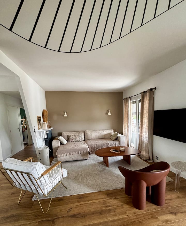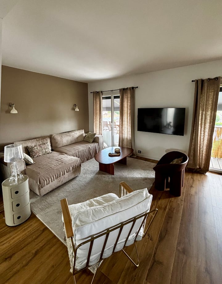 La nostra casa è composta da un soggiorno con soggiorno/ sala da pranzo e cucina moderna. Affacciato sulla terrazza sospesa dotata di mobili da giardino, tavolo da pranzo e plancha. Una bella stanza, un bagno e un bagno. Nel seminterrato c'è una grande camera con bagno privato e un bagno.