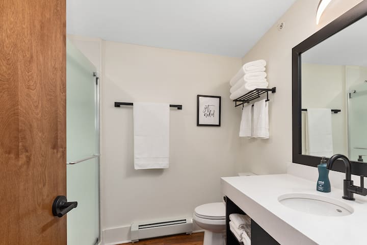 Come l'intera Lehigh Suite, i bagni sono nuovissimi, moderni e pulitissimi! Sono inoltre completamente riforniti per la tua visita con asciugacapelli, sapone, balsamo e shampoo.