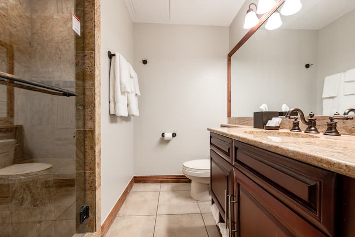 Il tuo soggiorno include l'accesso a più piscine riscaldate, spa, palestra, sala giochi, ristoranti di lusso, servizio di sci e molto altro! Il resort offre tutto il necessario per un soggiorno rilassante. Dopo una lunga giornata in montagna, torna al tuo letto matrimoniale grande, goditi la fantastica doccia a vapore in stile europeo e rilassati con la persona amata!