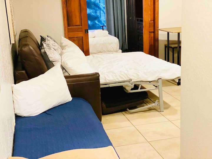 Questa unità è un monolocale con porte a scomparsa che separano la camera da letto. Quando il divano letto è aperto, limita lo spazio per camminare. Tienilo presente al momento della prenotazione, in modo che, se utilizzi il divano letto, capisca che lo spazio a disposizione è notevolmente più piccolo. Vedi foto per divano letto aperto nello spazio.