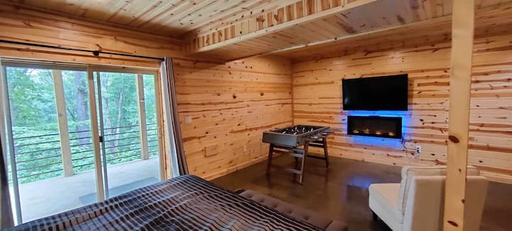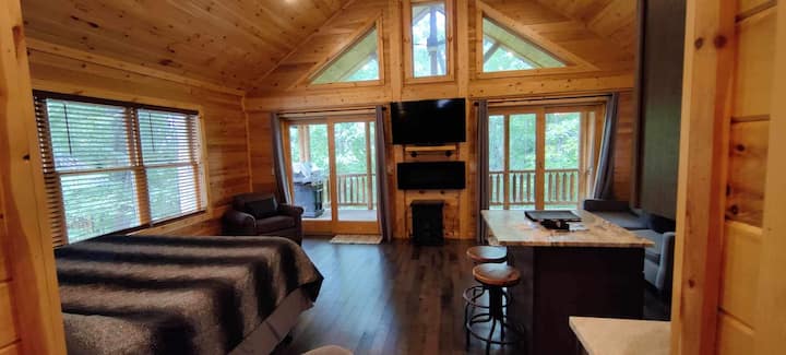 Rifugiati nel fascino tranquillo di Malbec Cabin #5, un rifugio accogliente e moderno immerso in un tranquillo vicolo cieco all'interno del pittoresco Hocking Hills Cabins & Resort. Questo cottage progettato con cura presenta un ampio monolocale a pianta aperta con alti soffitti a cattedrale, perfetto per una fuga romantica o per piccoli gruppi.