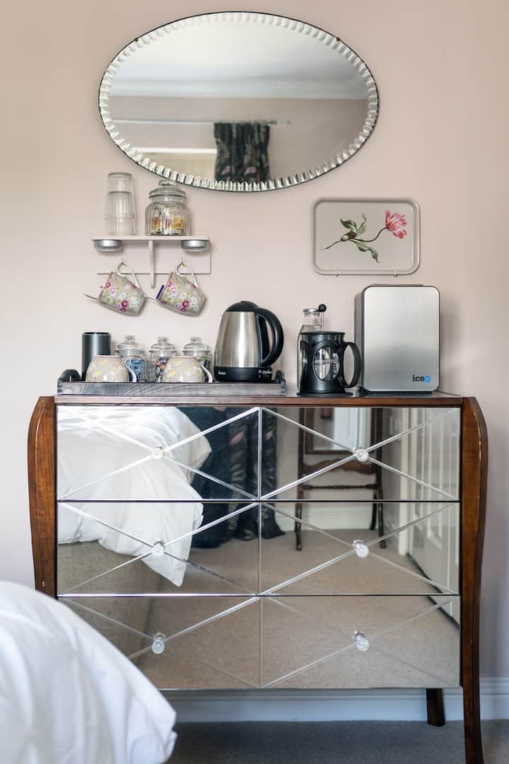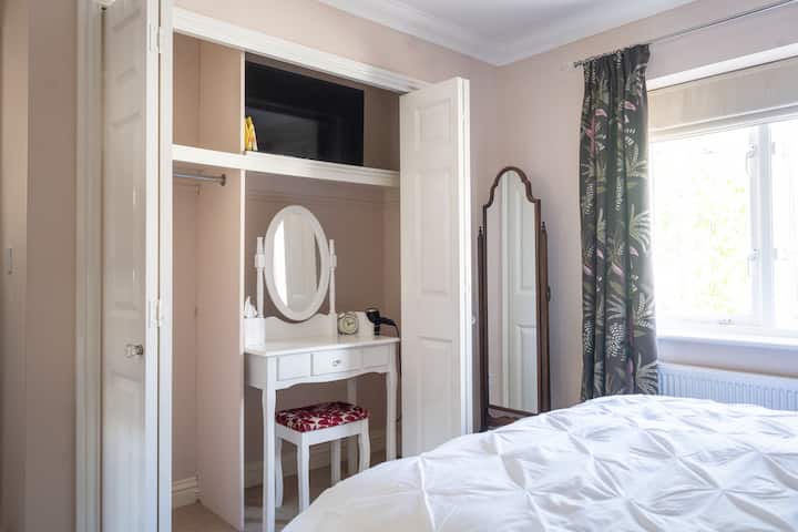 Camera matrimoniale privata bella, pulita e confortevole al piano superiore all'interno di una casa indipendente moderna e familiare. La finestra si affaccia su una tranquilla strada residenziale. La camera ha una serratura e un bagno privato con una buona doccia, una TV, un vassoio di benvenuto ben fornito con mini frigo, spazio per appendere e cassetti e un piccolo tavolo da toeletta/scrivania con sgabello. La toletta/scrivania è dotata di asciugacapelli e di una presa per un computer portatile a portata di mano.