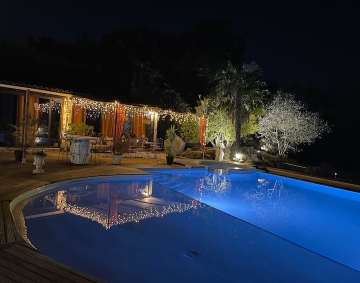 Al centro di questo complesso si trova la nostra magnifica piscina a sfioro di stagione di 12m*6 aperta sulla vasca idromassaggio ( non coperta, non riscaldata, quindi di stagione); dispone anche di una spiaggia che permette ai più piccoli di nuotare in sicurezza ( la sorveglianza dei genitori rimane ovviamente indispensabile, sapendo che nessuna barriera protettiva circonda la piscina). Salvagenti e materassino gonfiabile sono a disposizione; gli inquilini possono anche portare i loro.