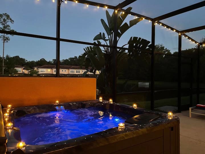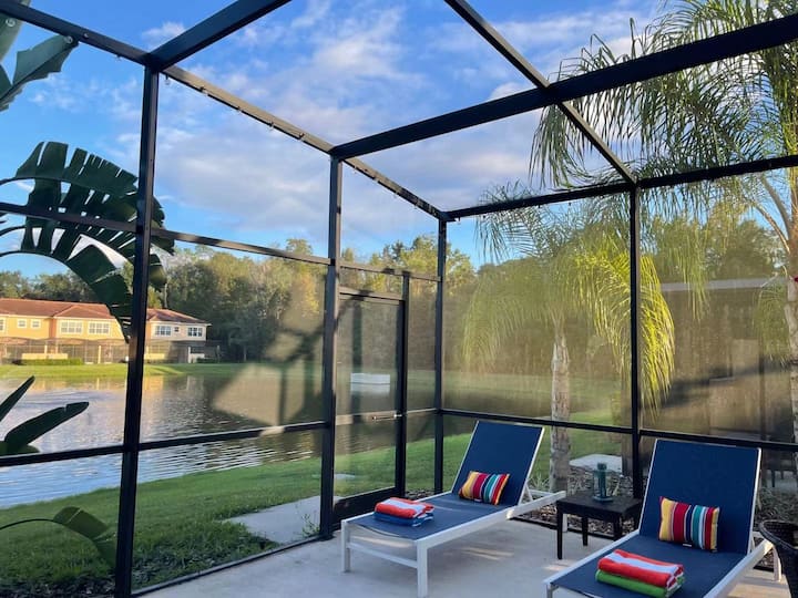 VISTA SUL LAGO! AMPIO PATIO CON JACUZZI PRIVATA E PAVIMENTO IN LEGNO IN TUTTE LE CAMERE DA LETTO! 4 TV! Wi-Fi GRATUITO! CAFFÈ GRATUITO! A 5 km dall'ingresso di Disney! A pochi passi dalla famosa Old Town/Fun Spot/negozi, fermata Uber/Lyft, autobus Lynx per Disney; a 15 minuti da SeaWorld, a 20 minuti da Universal. 3 camere da letto, 2,5 bagni, armadi in legno, bancone in quarzo, elettrodomestici in acciaio inox; piscina, scivoli d'acqua, fitness, tennis, ristorante, bar, minimarket e guardia di sicurezza 24 ore su 24