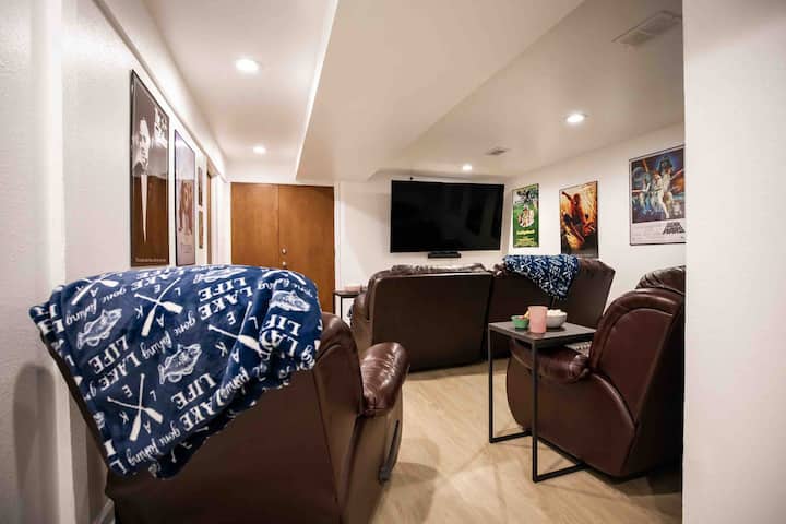 Sala teatro: offriamo posti a sedere per 8 persone (o accoccolatevi e diventano 10!). Dispone di una TV Samsung da 80’(accedi con il tuo accesso personale per Netflix, Hulu, Amazon Prime, Disney+, ecc.) Bose surround bar, divani in pelle con opzioni reclinabili, una chaise longue e una poltrona reclinabile tutti con coperte e tavolini per quelle gustose prelibatezze per l'intera esperienza teatrale.