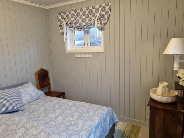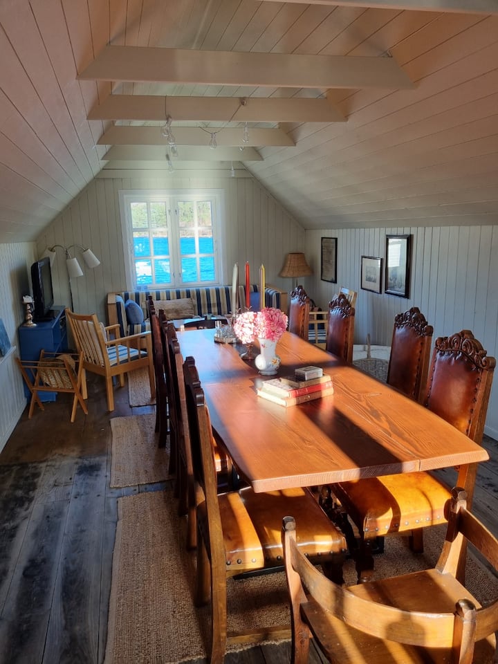 Bua går over to plan og inneholder ett soverom med dobbeltseng, som kan deles til to enkeltsenger. Det leies i utgangspunktet ut for 2 personer, men etter avtale kan det ordnes i stand inntil to svært enkle soveplasser i 2. etasje mot et lite tillegg i pris. Det kommer en del henvendelser om man kan ha med husdyr, dessverre lar dette seg ikke gjøre av hensyn til allergia. Kjøkkenet har alt du trenger for å lage et godt måltid. C'è anche una lavastoviglie, un tavolo da pranzo con una bella vista sul mare, e un piccolo angolo con una sedia. Bagno con doccia. Il soggiorno e il piano superiore sono arredati con soffitti alti, travi a vista, un lungo tavolo con spazio per molti e un divano romantico. Alt med nydelig utsikt ut over sjøen.