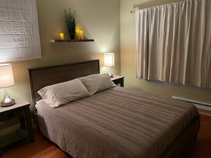 Il letto matrimoniale principale ha un nuovo materasso Nectar e lenzuola di cotone di alta qualità. La camera da letto include sia tende oscuranti che un generatore di rumore bianco per dormire, se lo desideri!