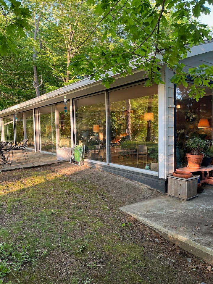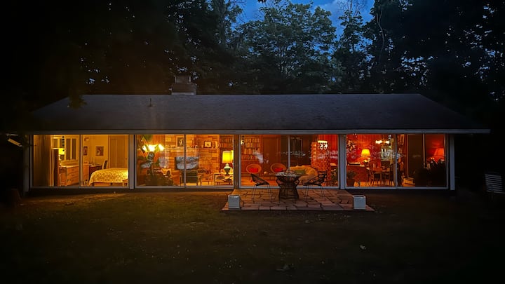 Casa sul lago con pareti in vetro nella Hudson Valley