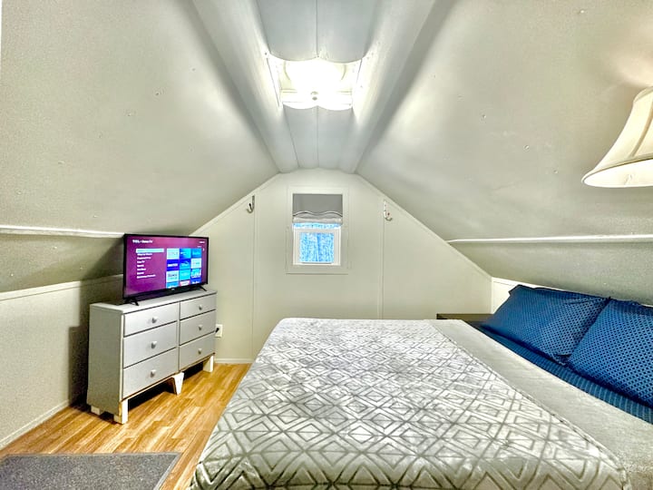 *Il bagno si trova al piano principale, mentre la camera da letto soppalcata è al piano superiore. Se preferisci non utilizzare le scale, il divano si apre anche su un letto a due piazze. Il divano letto è progettato per comodità e comfort; se sei sensibile ai materassi, il letto è consigliato.*