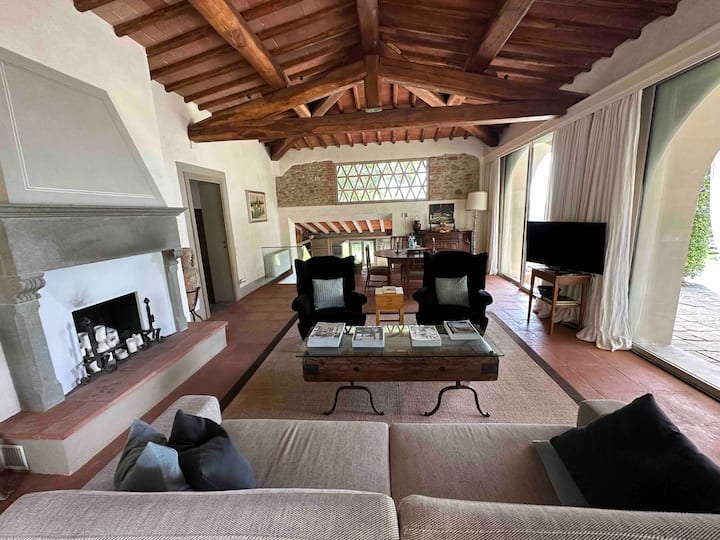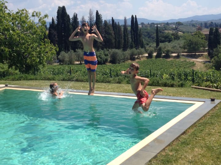 Villa Cortevecchia (Superhost) è una casa colonica toscana di 700 anni ristrutturata secondo gli standard occidentali. Comfort rustico e moderno! In cima a una splendida collina panoramica, piscina, aria condizionata, giardino enorme. Direttamente sulla Strada del Chianti, a 30 metri a piedi dalla cantina Le Corti. A 17 minuti da Firenze, Piazza Michelangelo. Posizione perfetta! Splendida! *Siamo sempre stati "superhost" in passato, ma abbiamo smesso di affittare per alcuni anni, quindi abbiamo perso lo stato, ma guarda tutte le recensioni! ❤️Abbiamo sostituito i divani bianchi perché avevano 13 anni. Abbiamo aggiunto altri mobili all'esterno! Miglioramenti!