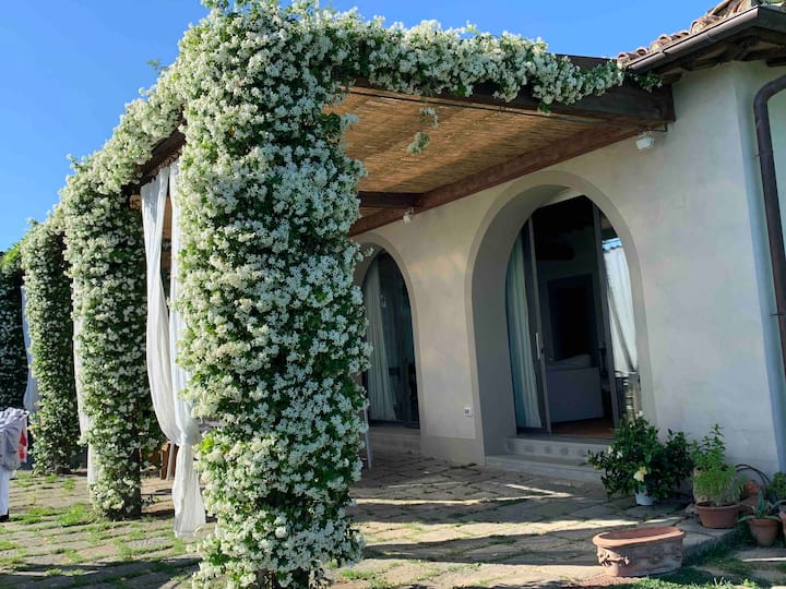 Questa casa è una parte di un casale di 700 anni. L'abbiamo comprata 12 anni fa. Ci sono voluti 8 anni per ristrutturarla. L'abbiamo ristrutturata con un tocco tradizionale toscano, molti oggetti d'antiquariato e materiali toscani, mantenendo un'atmosfera minimalista, pulita, fresca e moderna. È molto pulita e facile da vivere. Assolutamente bellissima! Enormi finestre di vetro in tutta la casa. Incredibile luce naturale e vista sul giardino e sui vigneti da tutte le finestre.