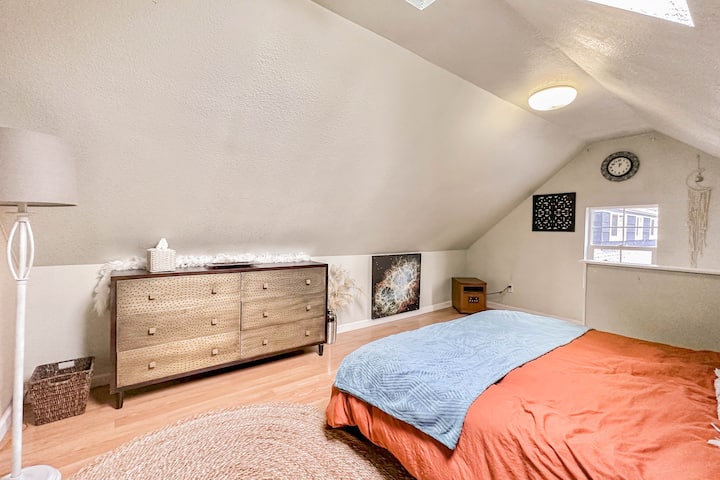 All'altra estremità della cucina ci sono le scale per il secondo piano, che conducono alla camera da letto principale. Lì troverai un letto matrimoniale (materasso in memory foam rigido di Lull), un comò e una poltrona da lettura. Non è l'ideale per gli ospiti alti, poiché il soffitto è inclinato. Anche il letto è molto basso. Di recente ho aggiunto una televisioneziata per Roku. In questa stanza fa piuttosto caldo, quindi ci sarà un condizionatore alla finestra durante i mesi caldi. C'è anche un lucernario che sarà coperto durante l'estate. Puoi aprirlo durante il soggiorno.
