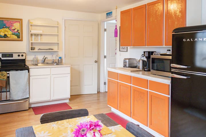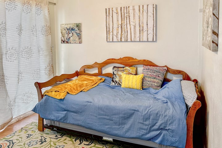 Zona soggiorno luminosa e ariosa ma piccola, con comoda sedia a dondolo girevole e un divano. C'è una grande TV con canali di base e roku per lo streaming. C'è anche un Echo Show da utilizzare, ma sarà impostato su silenzioso/nessun video finché non lo accenderai. Puoi riprodurre musica, chiedere informazioni sul meteo o porre qualsiasi altra domanda tu abbia!
