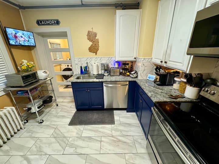 Cucina: lavastoviglie in acciaio inox + forno a microonde + frigorifero, cuoci-riso, frullatore, fornetto, macchina per il caffè Keurig, tostapane, molti piatti/utensili/tazze, pentole/padelle, portaspezie, filtro per l'acqua Brita, Smart TV da 24" con accesso alla telecamera di sicurezza, mini condizionatore con telecomando e condimenti vari.
