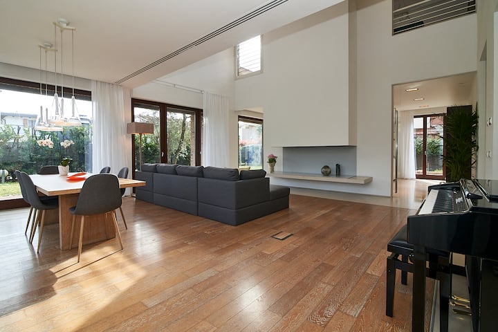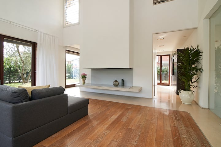 L’ingresso avviene al piano terra su uno splendido leaving caratterizzato da un ambiente luminoso e accogliente, dove trascorrere momenti di relax in compagnia della famiglia o degli amici. Le grandi vetrate che si affacciano sul giardino permettono alla luce del sole di inondare la stanza, creando un'atmosfera calda e rilassante.