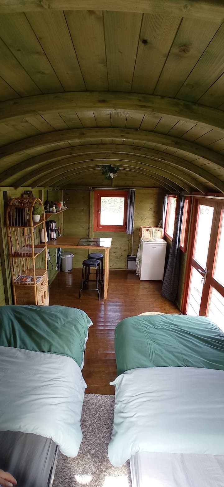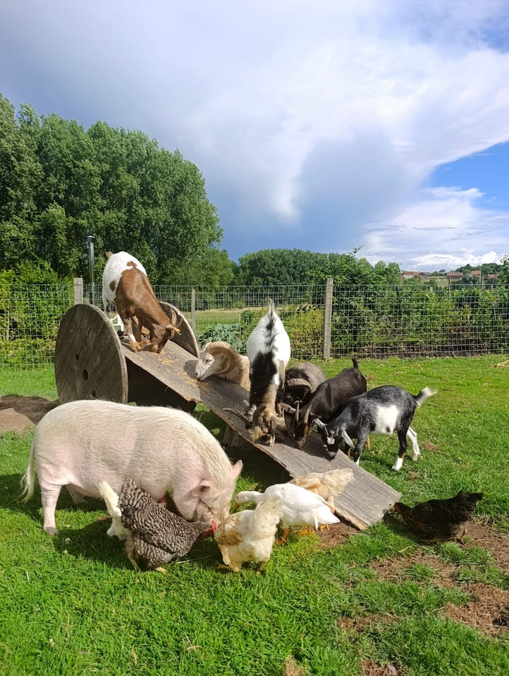 Amiamo anche le serate accoglienti e conoscere persone, quindi siamo aperti ad accogliere persone provenienti da tutto il mondo. In bici, a piedi... tutti sono i benvenuti nel nostro mini campeggio con un carrello e una roulotte + a volte camper e tende di passaggio.