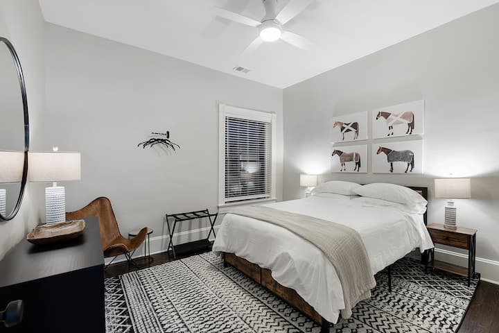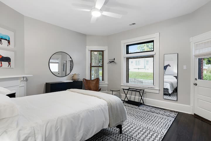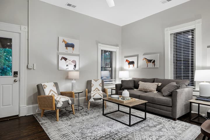 Questa dimora storica può ospitare fino a 6 ospiti in due spaziose camere da letto e due divani letto. La casa è stata completamente rinnovata nel 2023. È pieno di luce naturale, che offre uno spazio allegro e luminoso. Dispone di un proprio portico coperto arredato e condivide un ampio patio in mattoni con posti a sedere e focolare, e il cortile sul retro ha una recinzione per la privacy. C'è sia un parcheggio fuori strada dietro le case che un parcheggio gratuito su strada.