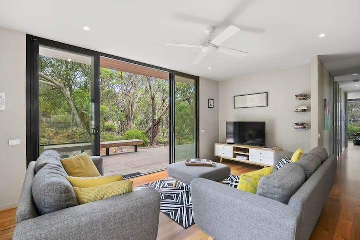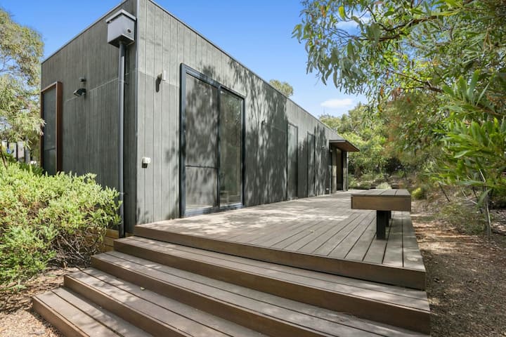 La zona giorno si affaccia sull'ambiente naturale della boscaglia e dispone di porte scorrevoli che si aprono su un ampio terrazzo, con barbecue e posti a sedere all'aperto sul lato della proprietà. C'è anche il vantaggio aggiuntivo di una seconda zona giorno che offre un rifugio separato per i bambini. Il cortile ha un piccolo braciere circondato da sedili in legno, il luogo perfetto per trascorrere la notte ammirando il cielo notturno, con un bicchiere di vino. Le assi del pavimento in tutta la proprietà non significano tappeti di cui preoccuparsi. In questa struttura è disponibile anche Wi-Fi.