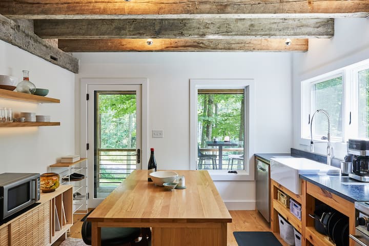 I travetti in pino massiccio antico di tutta la casa sono stati recuperati localmente, e la cucina presenta piani di lavoro in ardesia recuperati da un laboratorio scientifico di una scuola superiore della contea di Columbia degli anni '50. Dispone inoltre di un mobile da cucina a vista in pino bianco orientale con splendido lavello in porcellana e rubinetto di qualità professionale.