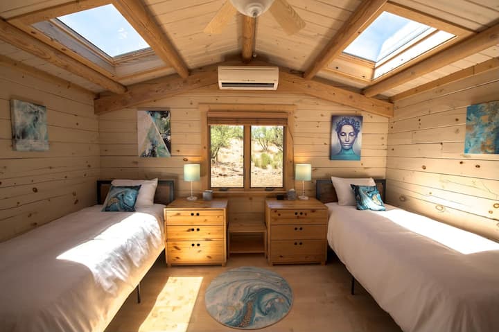 Rifugi Spirit of the Heavens: baite serene che uniscono fascino rustico e comfort moderno. Ogni camera offre due letti singoli o un letto matrimoniale grande, decorato con elementi ispirati al cristallo per una connessione più profonda. Bagni ecologici con prodotti biologici. Materassi Dream Clouds e biancheria da letto in bambù per un sonno riposante. Goditi caffè, tè e servizi convenienti in omaggio. Esplora i giardini, i labirinti e i vortici curativi. Prenota ora per un soggiorno rigenerante in linea con i tuoi valori.