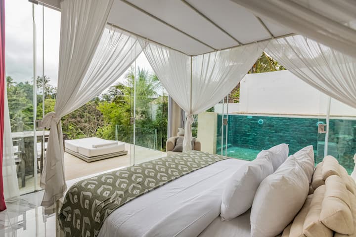 In qualità di nostri ospiti, potrete usufruire di tutti i nostri servizi interni. La nostra intenzione è quella di rendere il tuo soggiorno il più confortevole possibile attraverso il nostro servizio su misura a 5 stelle. Il nostro personale cordiale è felice di aiutarti con tutto ciò di cui hai bisogno. Il nostro autista privato può fornire un servizio di tour nei dintorni di Bali, tra cui gite in spiaggia, visite a templi, cascate, foreste di scimmie e altri siti, a un costo aggiuntivo. Forniamo un servizio di pulizia giornaliero con asciugamani, lenzuola e articoli da bagno puliti. Inoltre hai accesso a 3 splendide piscine, tra cui l'iconica Infinity Glass Pool, l'altalena di Bali e la tua vasca privata, la nostra vasca da bagno e l'amaca del cielo.