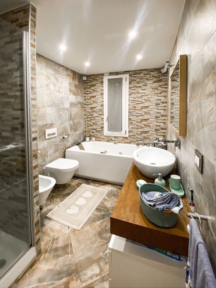 A disposizione degli ospiti tutto il piano terra dell'appartamento tranne l'area della cucina. Il bagno, con finestra sulla collina, wc, bidè, lavabo, doccia e vasca idromassaggio, è condiviso con me.