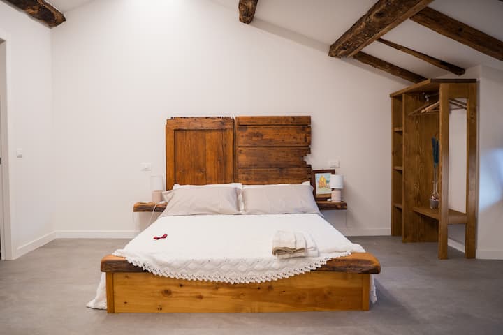 La Stanza Olga è un loft romantico e luminoso, situato nella mansarda della Casa dei Nonni, dove il legno antico e le travi a vista raccontano storie di famiglia e di tempo che scorre lento. Il letto matrimoniale è incorniciato da angoli intimi e dettagli rustici, con la possibilità di aggiungere un letto singolo o un pouf trasformabile per un ospite extra. L’ambiente è climatizzato e pensato per il relax, con lenzuola fresche e morbide sempre disponibili.