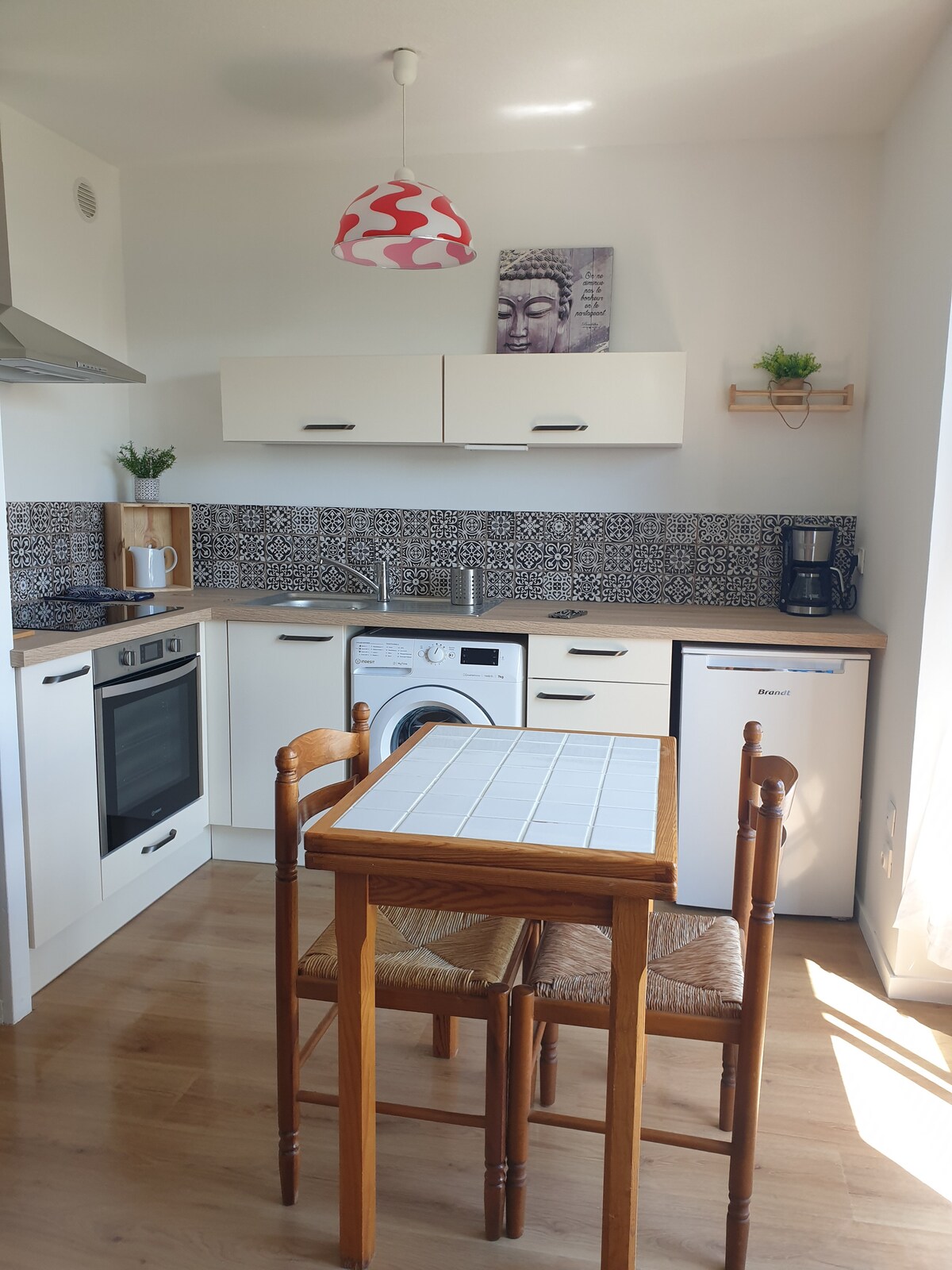 Nuovo appartamento (2018) T2 di 39m2, Molto luminoso al 1° piano di una casa indipendente con ingresso separato. È composto da: •di una zona pranzo con cucina attrezzata. •un soggiorno con divano non convertibile. •una camera con un letto da 140 con armadio. •di un bagno con doccia e servizi igienici. •una cantina con lavanderia. •1 terrazza di 15 m2. •un garage per biciclette. •Check-in dalle ore 15.00 e check out entro le ore 10:00.