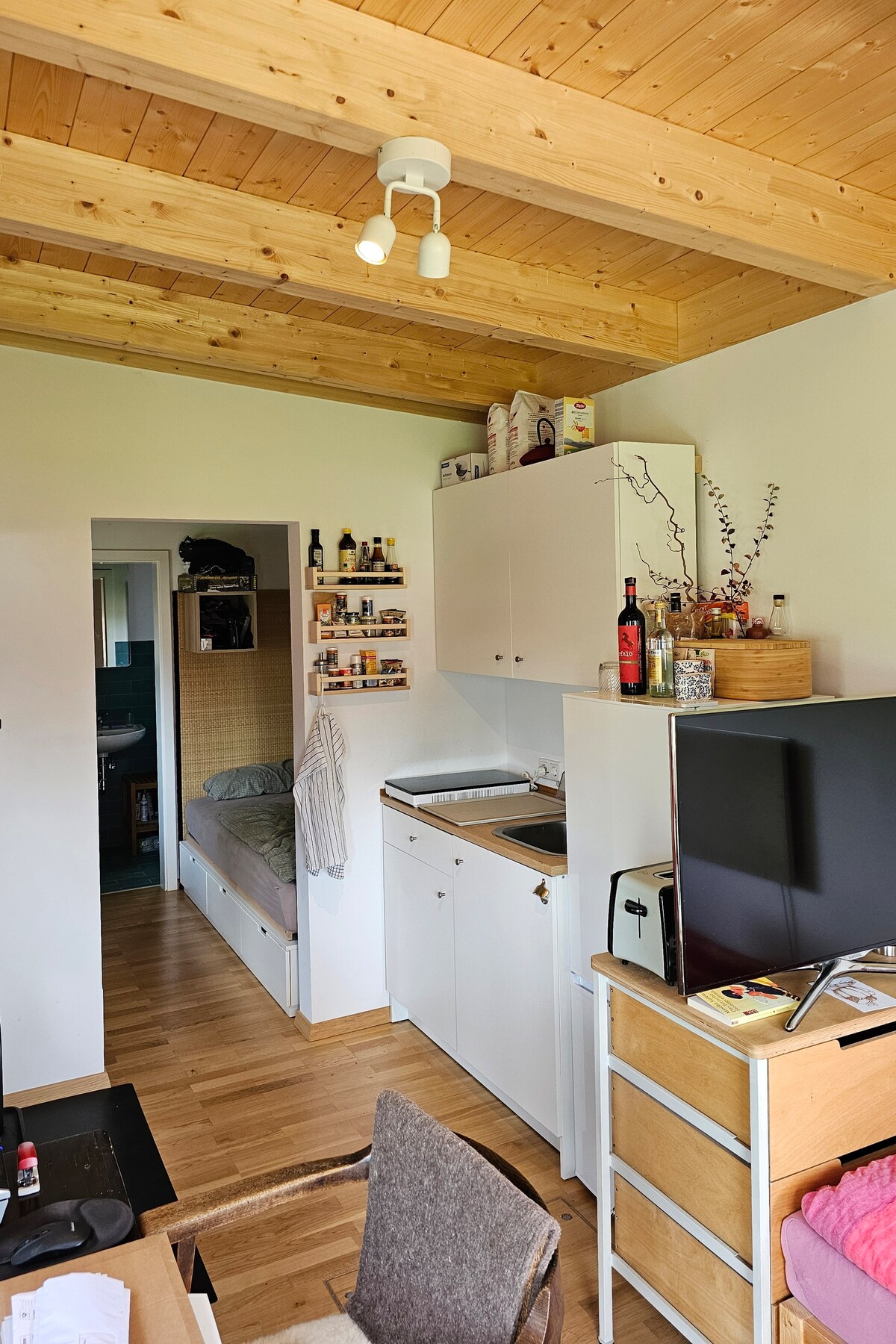 Komfortables 24 qm Tiny House mit 4 Schlafplätzen, 2 elektrischen Heizungen, Holzofen und großem Bad. Satelliten-TV, Wlan + sehr gutem Handyempfang. Elektr. Fasssauna zur alleinigen Benutzung, große Wiese mit Obstbäumen, Feuerstelle und schöner Aussicht mit Liegemöbeln. Geschotterte Parkplätze. Zum Baden Silbersee in 2,5km und Perlsee mit Biergarten in 13km Entfernung. Es ist sehr ruhig am Ende eines Weilers gelegen. Ihr seid im Garten für Euch alleine.