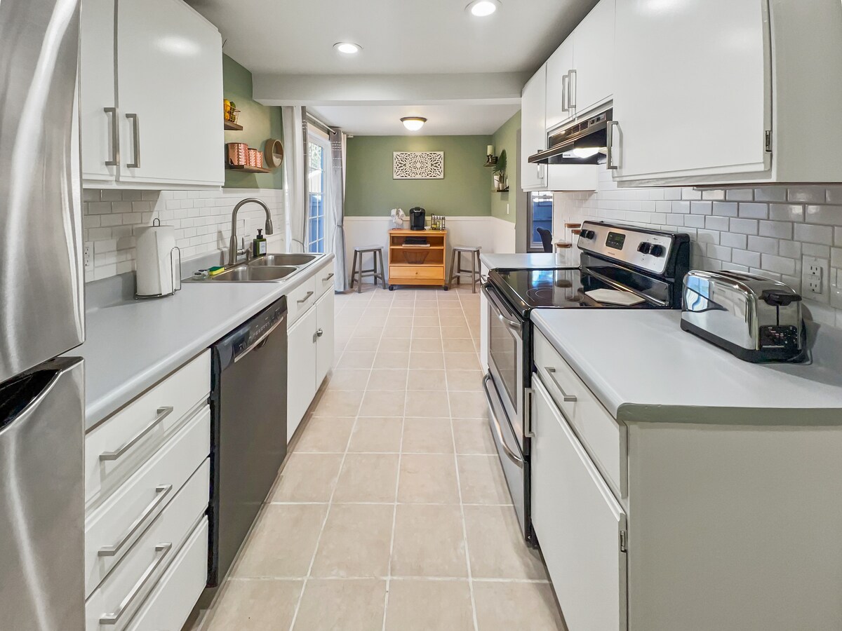 Questa è una rimessa per carrozze luminosa e ariosa, situata al secondo piano in un quartiere tranquillo e raggiungibile a piedi. Il soggiorno ha uno schermo per film a discesa e un divano nuovo di zecca con chaise longue e letto matrimoniale estraibile. La cucina è nuova e dispone di piano cottura, forno e lavastoviglie Smeg. La camera da letto ha un letto regolabile queen-size, TV da 52 pollici con wifi e cavo. Il bagno è dotato di vasca da bagno, cabina doccia e lavabo con doppio lavandino. C'è una lavanderia con lavatrice e asciugatrice. Il proprietario è un agente immobiliare