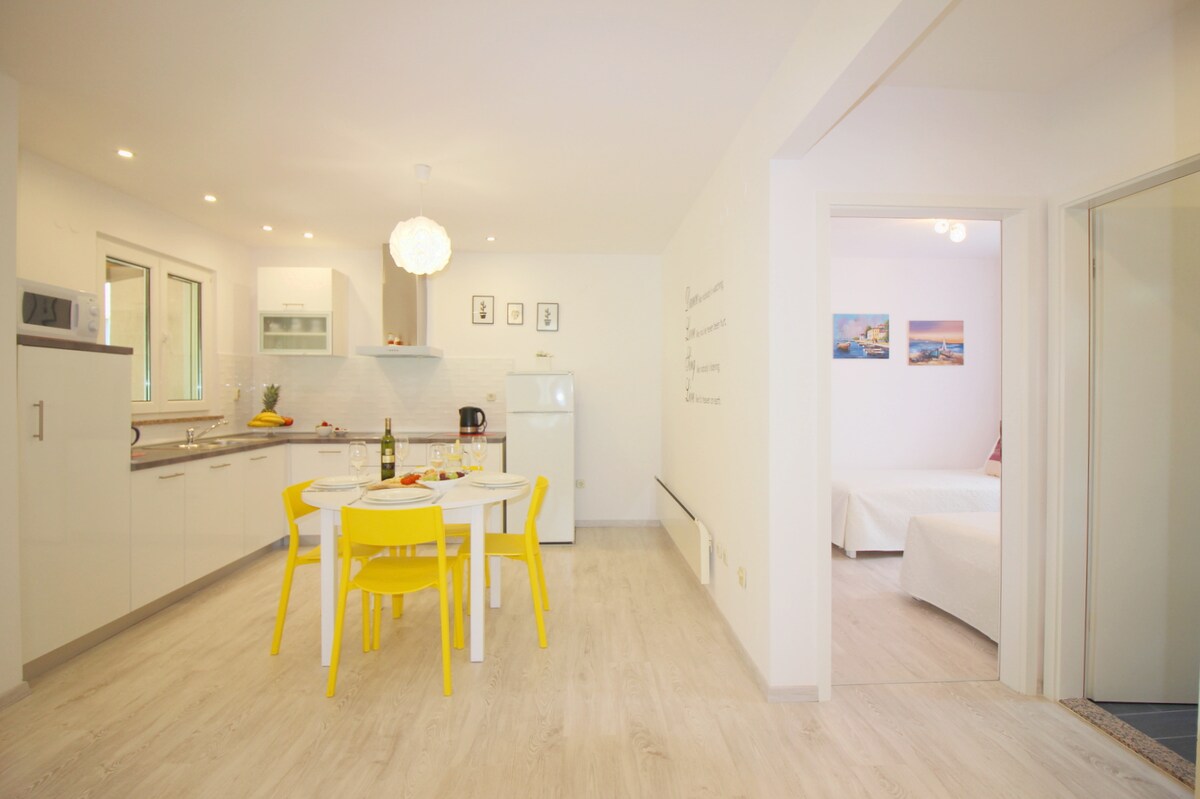 La struttura copre 35m2 e può ospitare il seguente numero di persone: 2+1. Nell'appartamento c'è una camera da letto, un soggiorno dove una persona può dormire sul divano, cucina, bagno con doccia e una grande terrazza con parte privata del giardino attrezzata con grill e mobili da giardino. La cucina è attrezzata con tavolo e sedie per ogni persona; utensili da cucina, pentole, posate, stoviglie, fornello elettrico, frigorifero con congelatore, macchina per il caffè. Casa indipendente, aria condizionata, aria condizionata inclusa nel prezzo, TV satellitare, biancheria da letto viene consegnata nel cambio settimanale, asciugamani forniti (2 asciugamani piccoli per persona a settimana), internet (WLAN), uso gratuito, i prezzi includono quanto segue: cambio della biancheria da letto (settimanale), pulizia finale alla fine del soggiorno, uso di elettricità, acqua, tassa e parcheggio. Terrazza propria, tavolo e posti a sedere forniti per terrazza, superficie della terrazza 20m2. Lavatrice presso il proprietario.