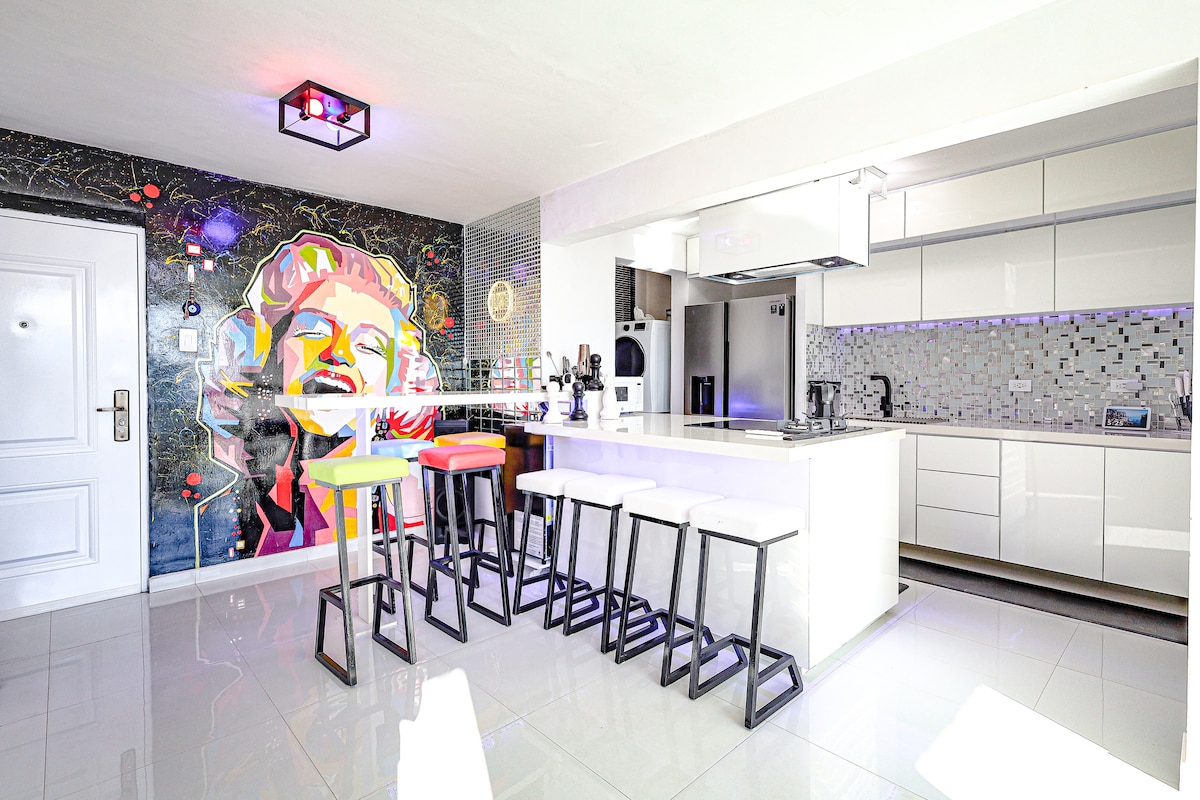 Disfruta de la comodidad de este refugio urbano con respaldo eléctrico y moderno diseño, a 5 min de todos los lugares de interés de S/C, cerca de todo, cocina full equipada con cafetera, arrocera, tostadora, sandwichera, microondas, utensilios de buena calidad, cuchillos profesionales , WiFi rápido, TV smart en cada área , A/C , nevera con hielo y agua calentador, lavadora- secadora , tanque de agua para emergencias, 1 puesto de estacionamiento techado entrada autónoma con caja de llaves 24/7