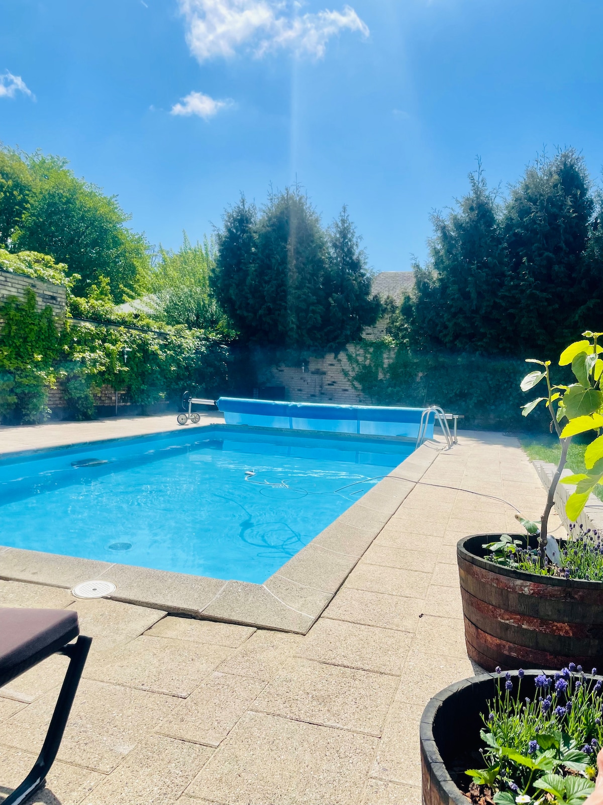 Moderne familiehus på blind stille vej, tæt på København. Solcelletag og varmepumpe forsyner rækkehuset med grøn energi, og i den solrige have nydes den opvarmede pool samt lounge- og spiseområde i orangeri. Bil-lader og kabel findes i carporten. Huset har 10 sovepladser fordelt på 5 værelser. Badestrand og skov samt tog/bus er indenfor radius af 2km. Indkøb og take-away mindre end 1km afstand.